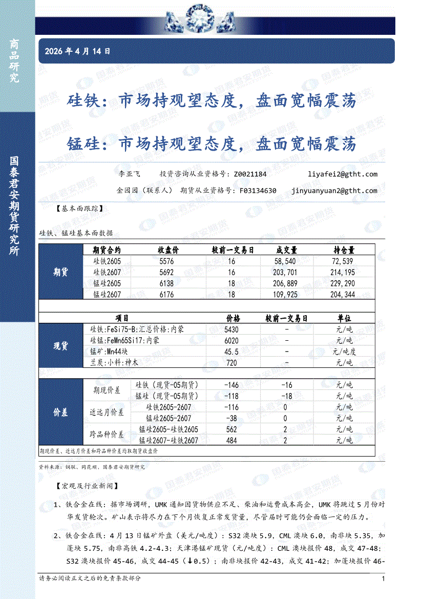 国泰君安期货-硅铁:市场持观望态度,盘面宽幅震荡,锰硅,市场持观望态度,盘面宽幅震荡-260414