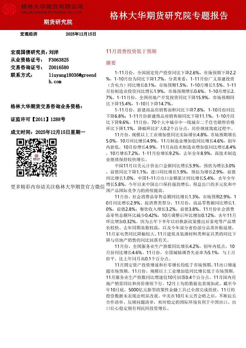 格林大华期货-研究院专题报告:11月消费投资低于预期-251215