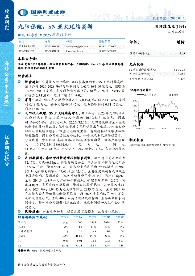 JS环球生活:国泰海通证券-JS环球生活-1691.HK-2025年年报点评:九阳稳健,SN亚太延续高增-260331