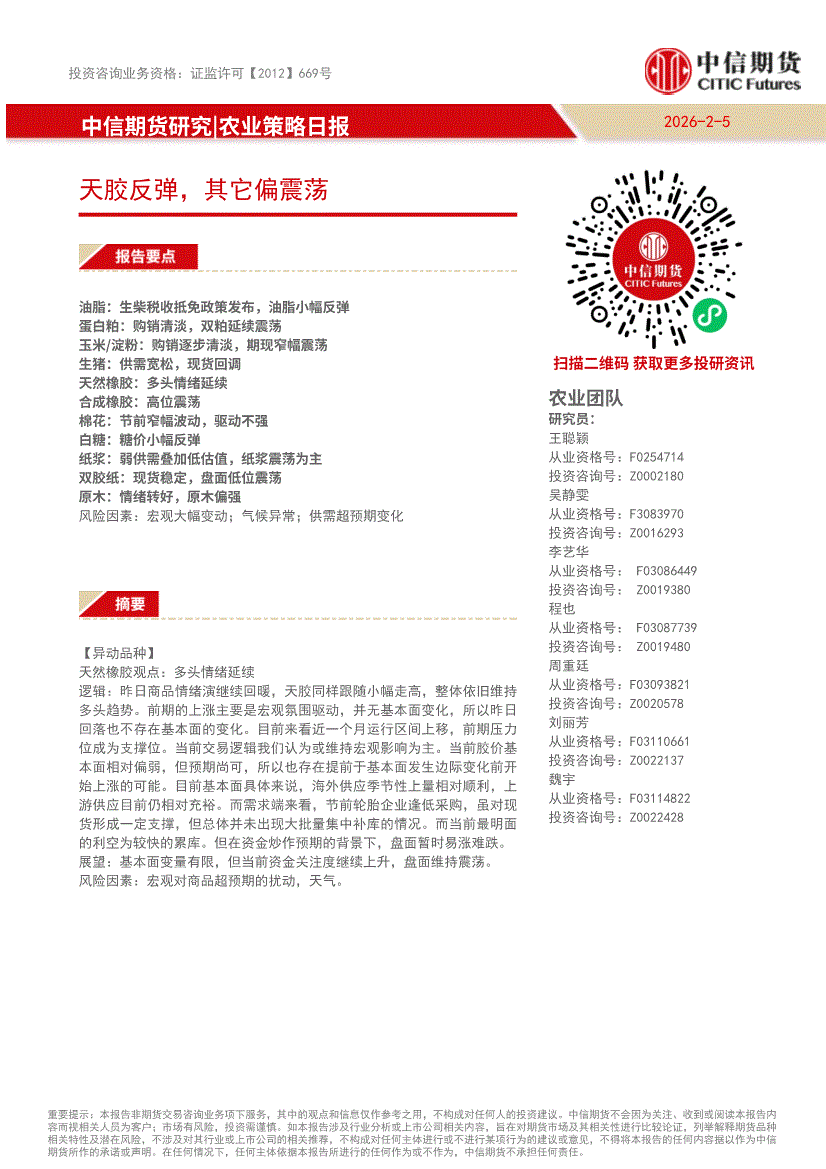 中信期货-农业策略日报:天胶反弹,其它偏震荡-260205