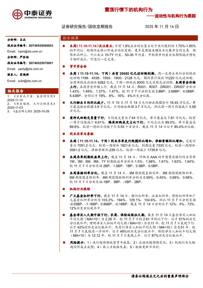 中泰证券-流动性与机构行为跟踪:资金偏稳,大行买短卖长-251102