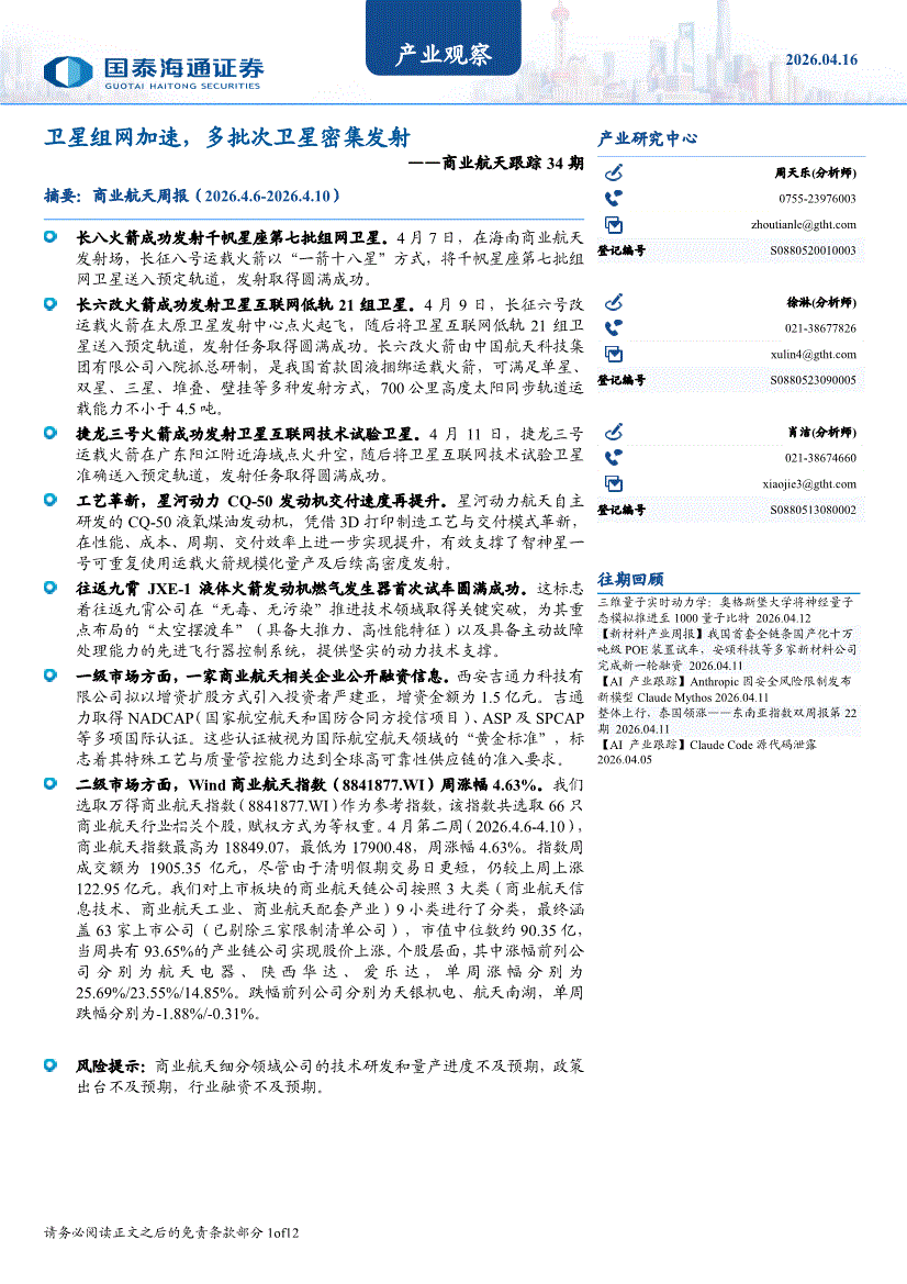 国泰海通证券-产业观察:商业航天跟踪34期,卫星组网加速,多批次卫星密集发射-260416