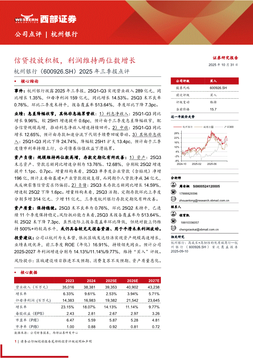 杭州银行:西部证券-杭州银行-600926-2025年三季报点评:信贷投放积极,利润维持两位数增长-251031