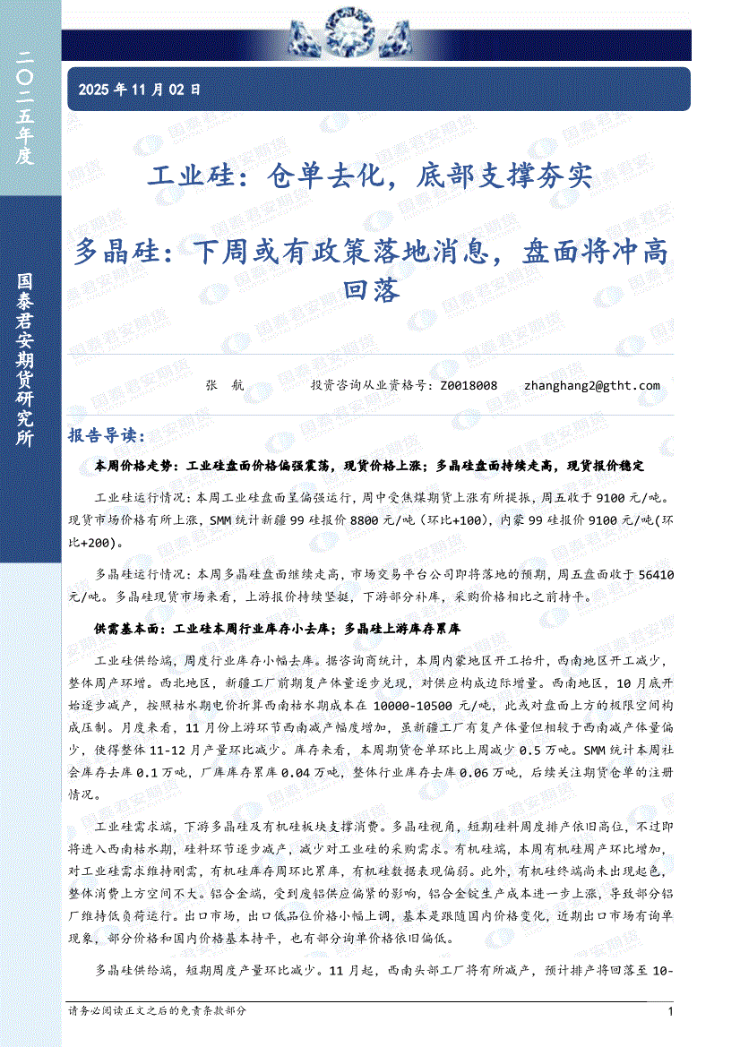 国泰君安期货-工业硅:仓单去化,底部支撑夯实,多晶硅,下周或有政策落地消息,盘面将冲高回落-251102