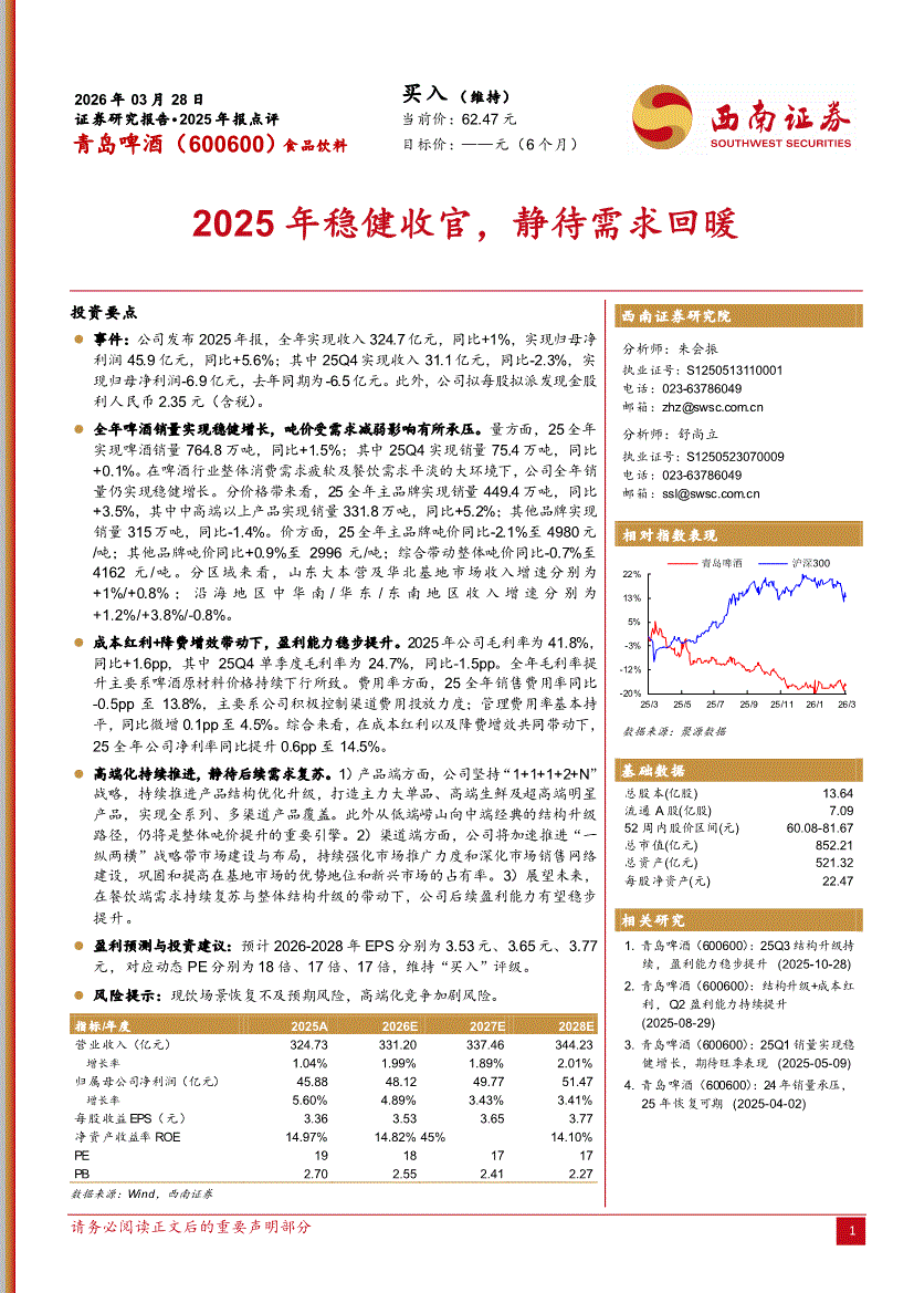 青岛啤酒:西南证券-青岛啤酒-600600-2025年稳健收官,静待需求回暖-260328