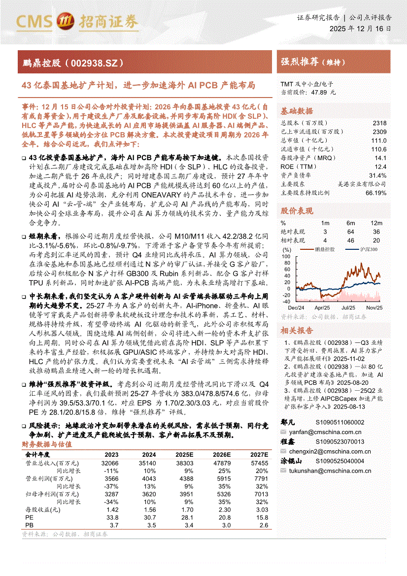 鹏鼎控股:招商证券-鹏鼎控股-002938-43亿泰国基地扩产计划,进一步加速海外AIPCB产能布局-251216