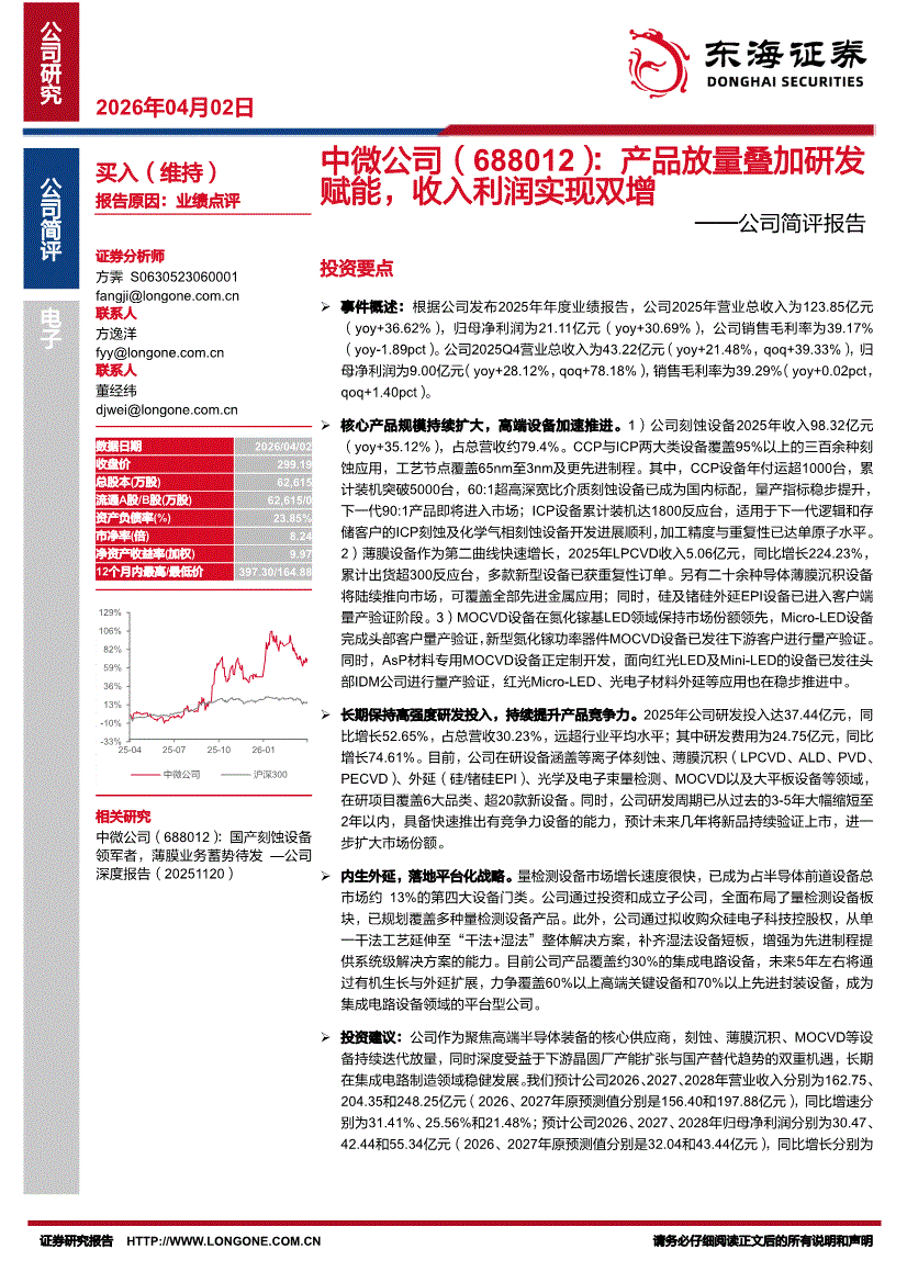 中微公司:东海证券-中微公司-688012-公司简评报告:产品放量叠加研发赋能,收入利润实现双增-260402