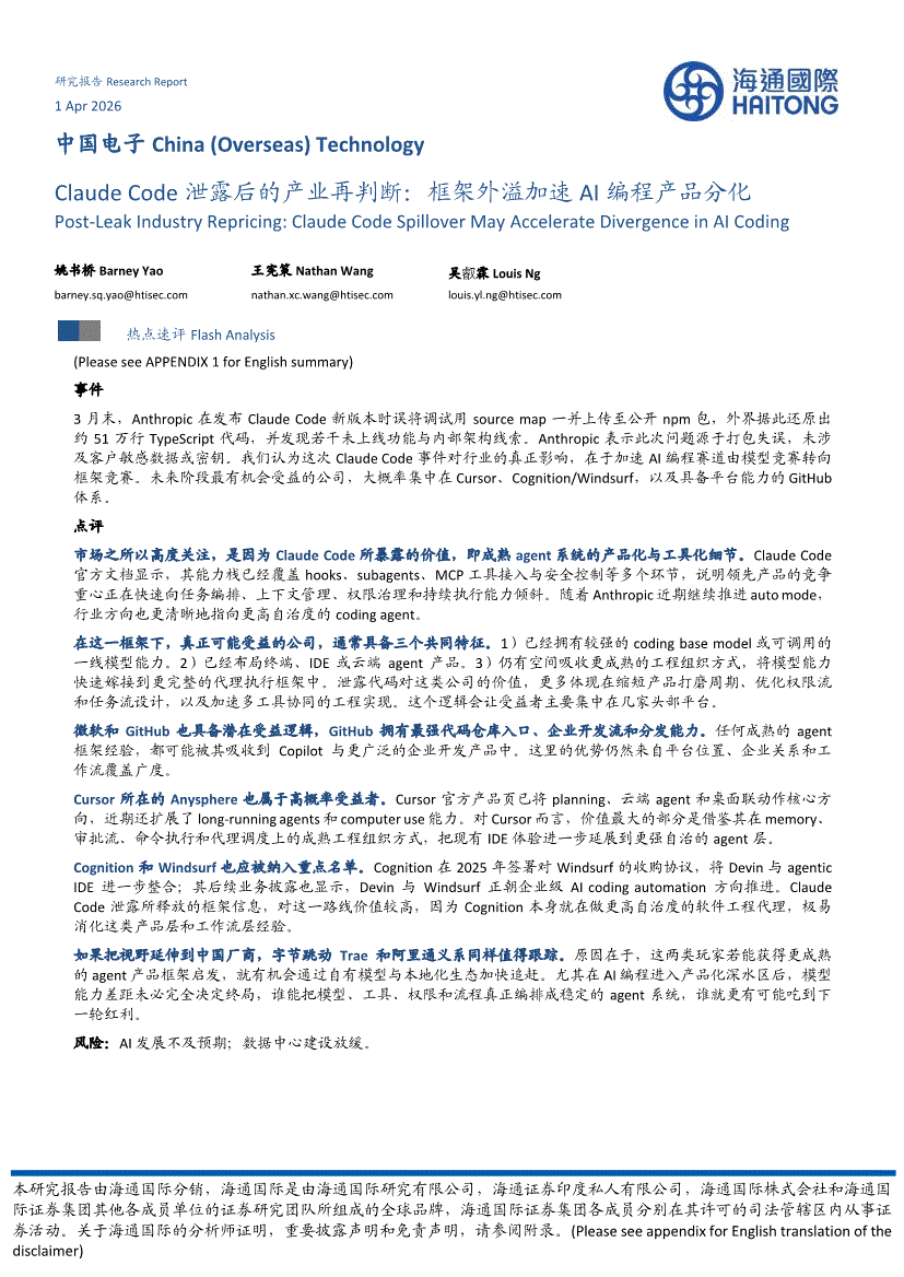 电子行业:海通国际-中国电子行业:Claude Code泄露后的产业再判断,框架外溢加速AI编程产品分化-260401