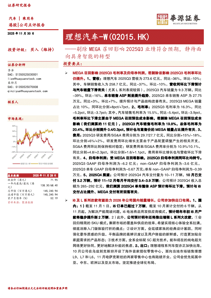 理想汽车~W:华源证券-理想汽车~W-2015.HK-剔除MEGA召回影响2025Q3业绩符合预期,静待面向具身智能的转型-251130