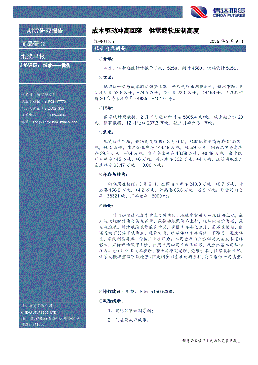 信达期货-纸浆早报:成本驱动冲高回落,供需疲软压制高度-260309