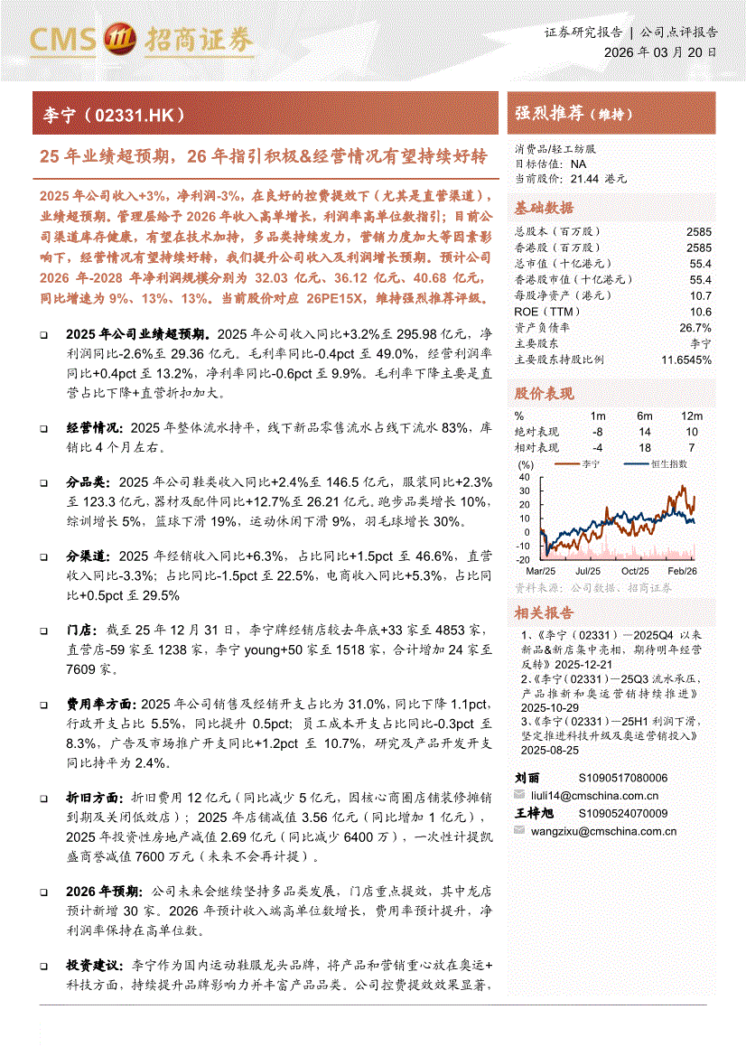 李宁:招商证券-李宁-2331.HK-25年业绩超预期,26年指引积极&经营情况有望持续好转-260320