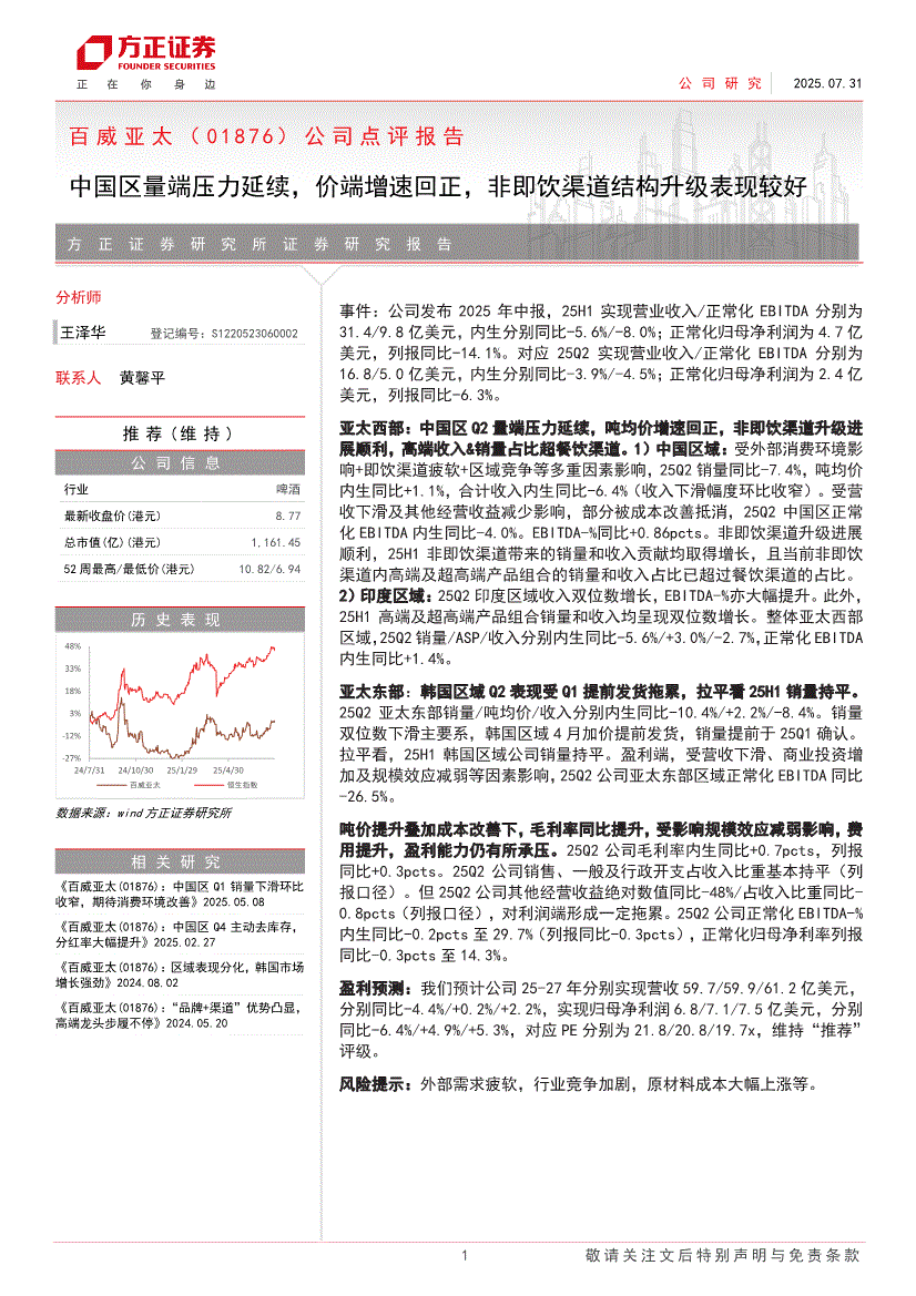 百威亚太:方正证券-百威亚太-1876.HK-公司点评报告:中国区量端压力延续,价端增速回正,非即饮渠道结构升级表现较好-250731