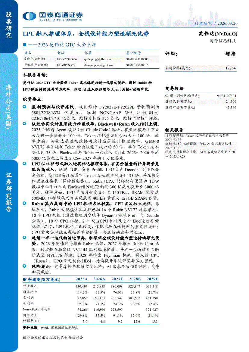 英伟达:国泰海通证券-英伟达-NVDA.US-2026英伟达GTC大会点评:LPU融入推理体系,全栈设计能力塑造领先优势-260320