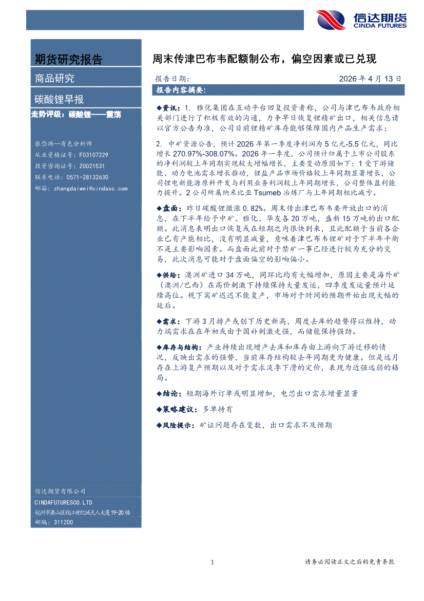 信达期货-碳酸锂早报:周末传津巴布韦配额制公布,偏空因素或已兑现-260413