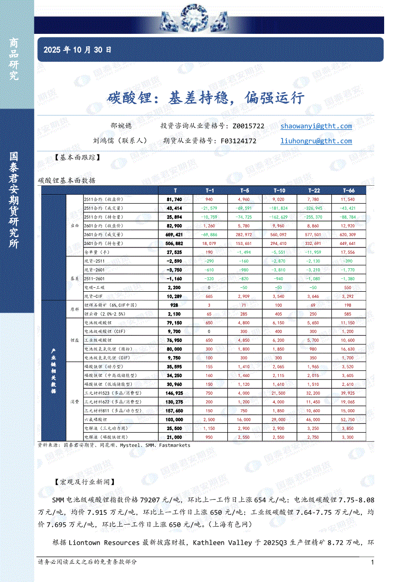 国泰君安期货-碳酸锂:基差持稳,偏强运行-251030