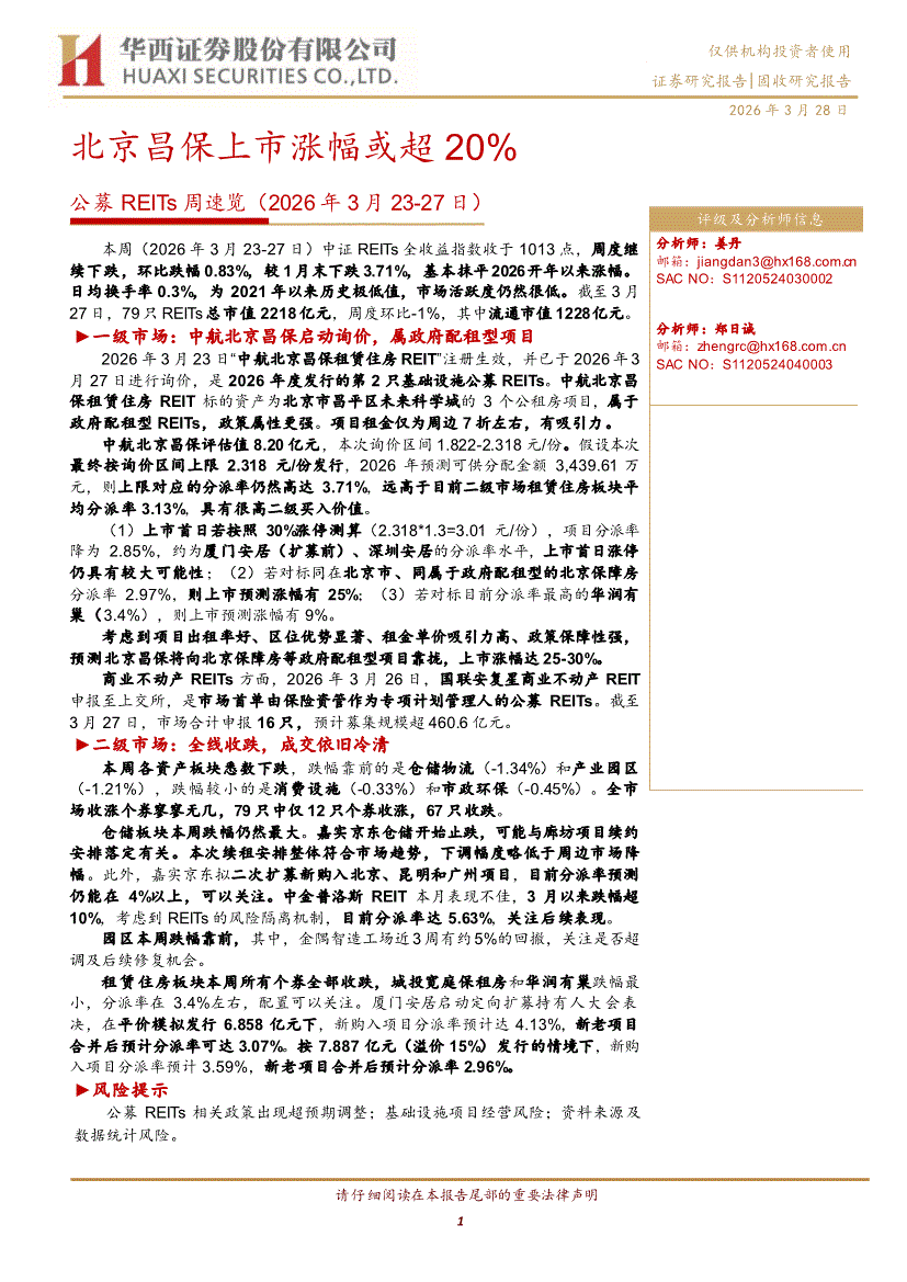 华西证券-公募REITs周速览(2026年3月23~27日):北京昌保上市涨幅或超20%-260328