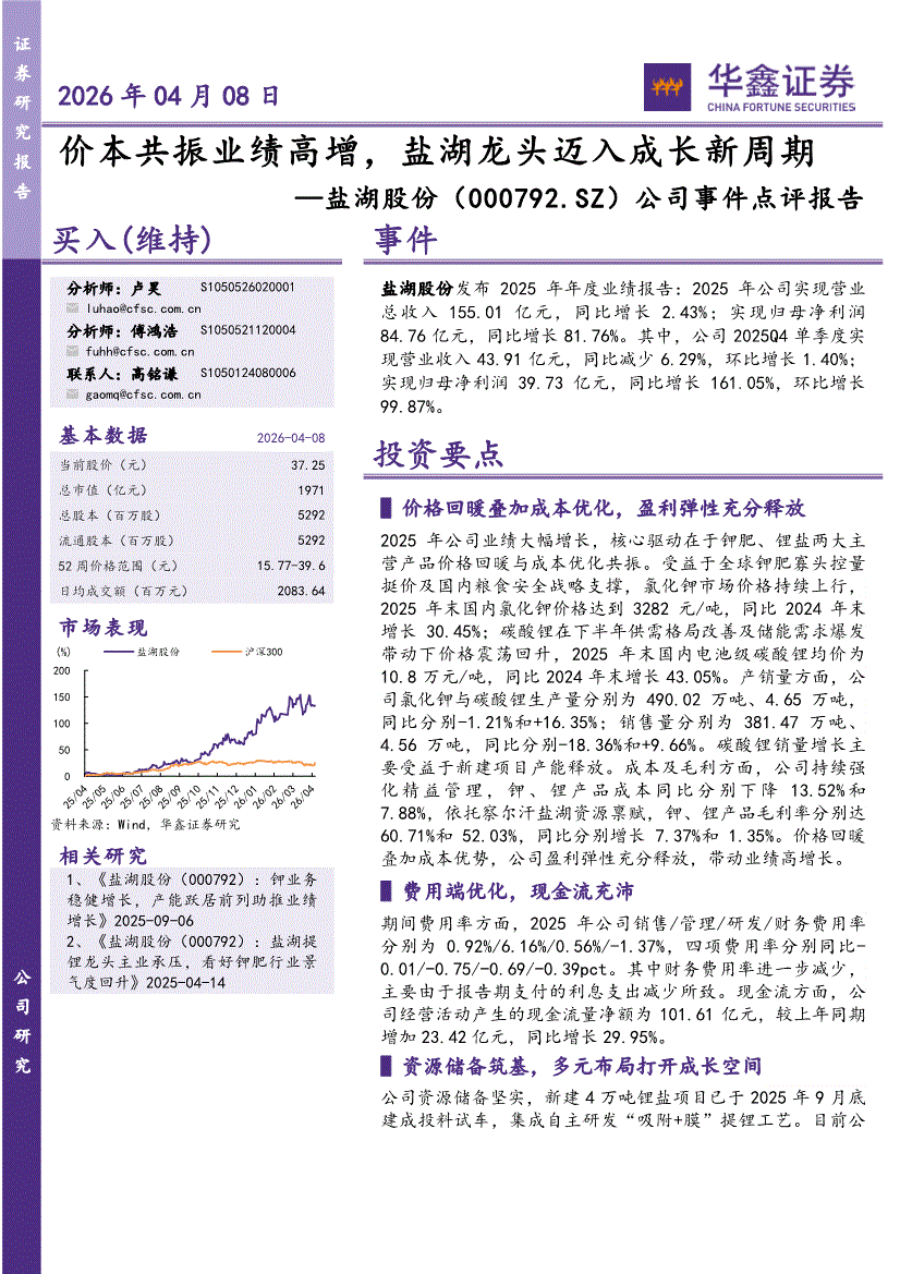 华鑫证券-盐湖股份-000792-公司事件点评报告:价本共振业绩高增,盐湖龙头迈入成长新周期-260408