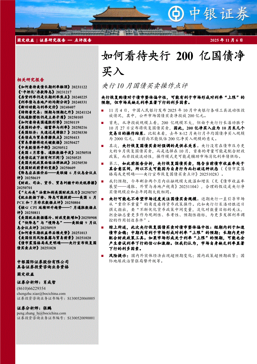 中银国际-央行10月国债买卖操作点评:如何看待央行200亿国债净买入-251106