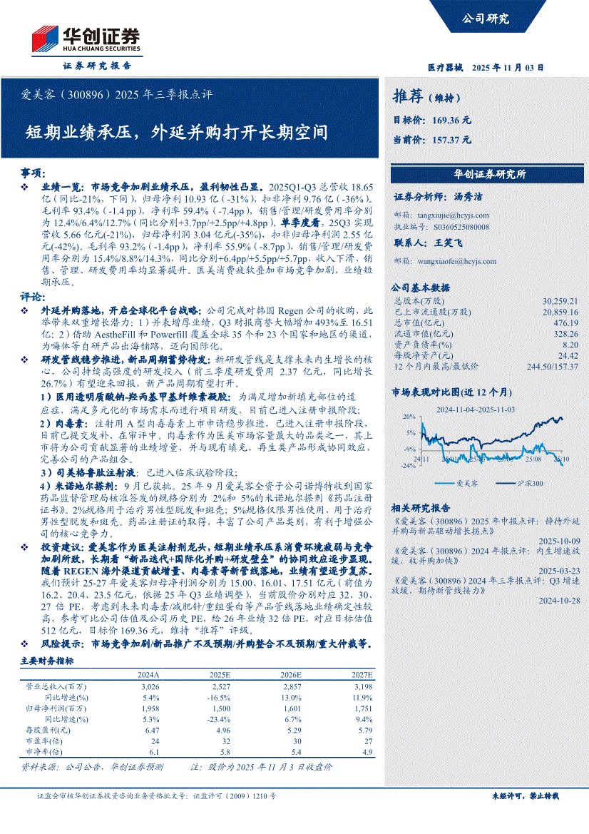 爱美客:华创证券-爱美客-300896-2025年三季报点评:短期业绩承压,外延并购打开长期空间-251103