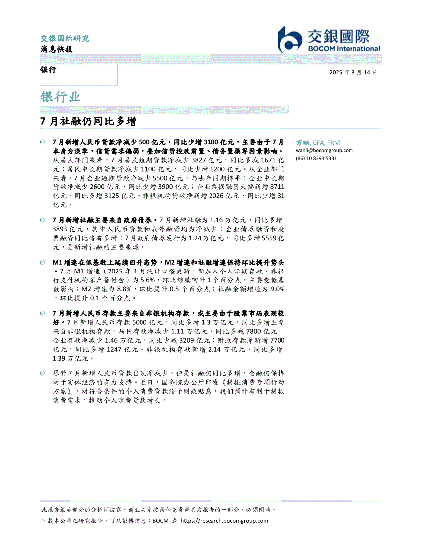 银行业:交银国际-银行业:7月社融仍同比多增-250814