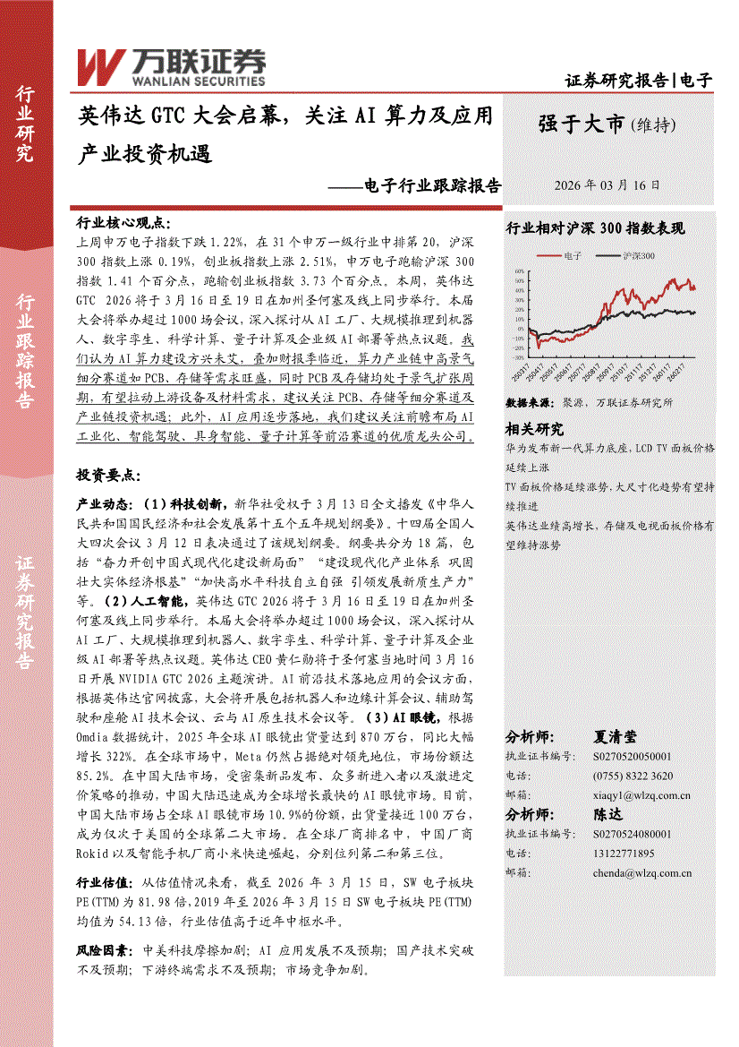 电子行业:万联证券-电子行业跟踪报告:英伟达GTC大会启幕,关注AI算力及应用产业投资机遇-260316