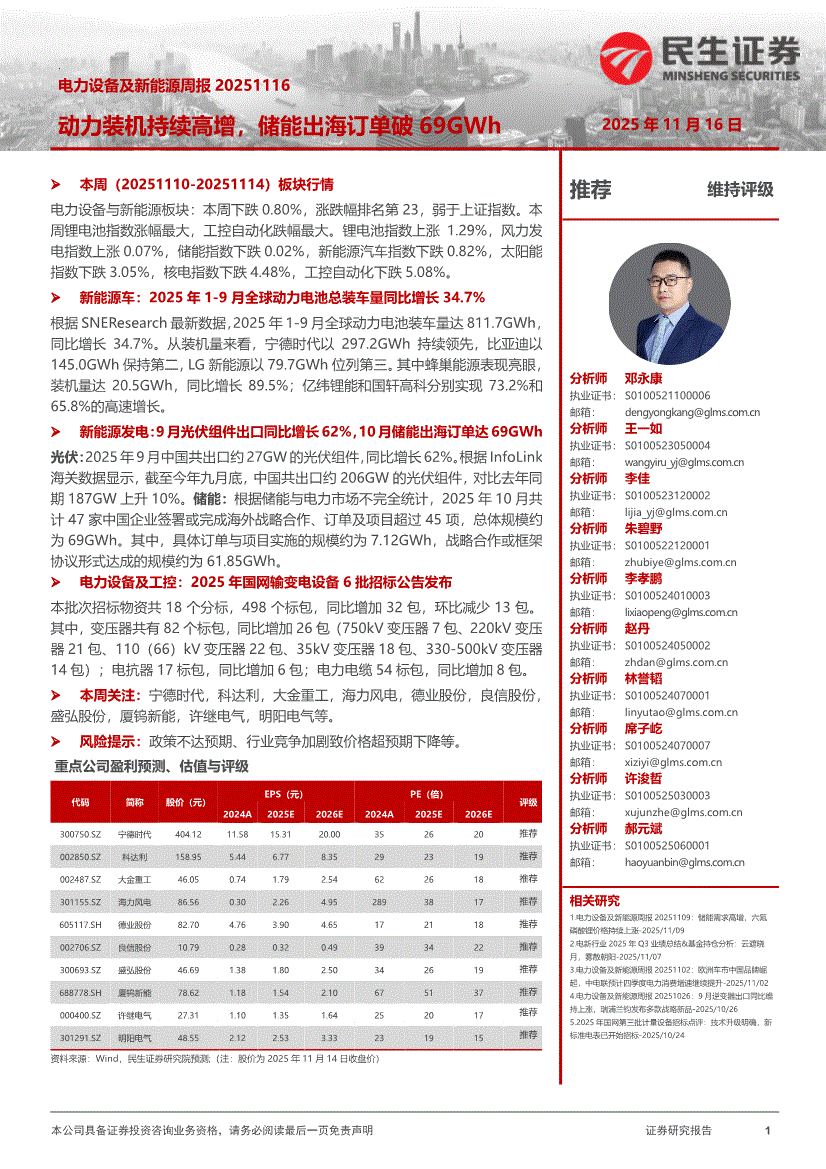 电力设备及新能源行业:民生证券-电力设备及新能源行业周报:动力装机持续高增,储能出海订单破69GWh-251116
