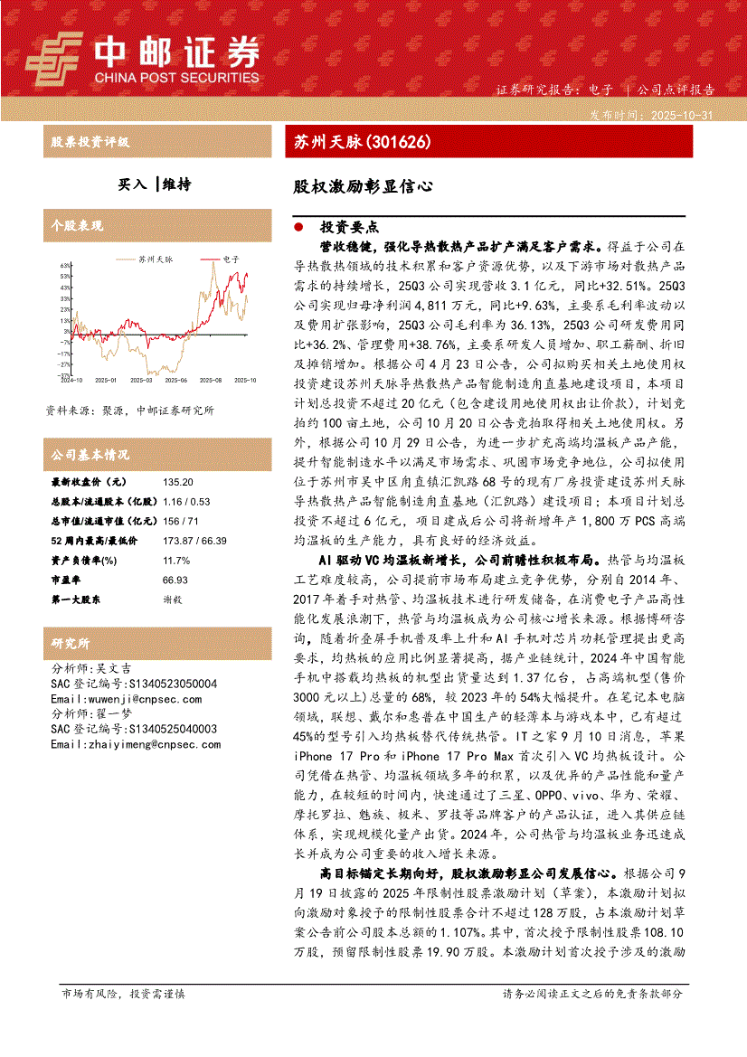 苏州天脉:中邮证券-苏州天脉-301626-股权激励彰显信心-251031