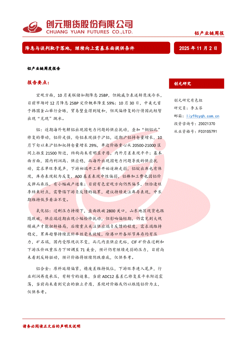 创元期货-铝产业链周度报告:降息与谈判靴子落地,继续向上需基本面提供条件-251102