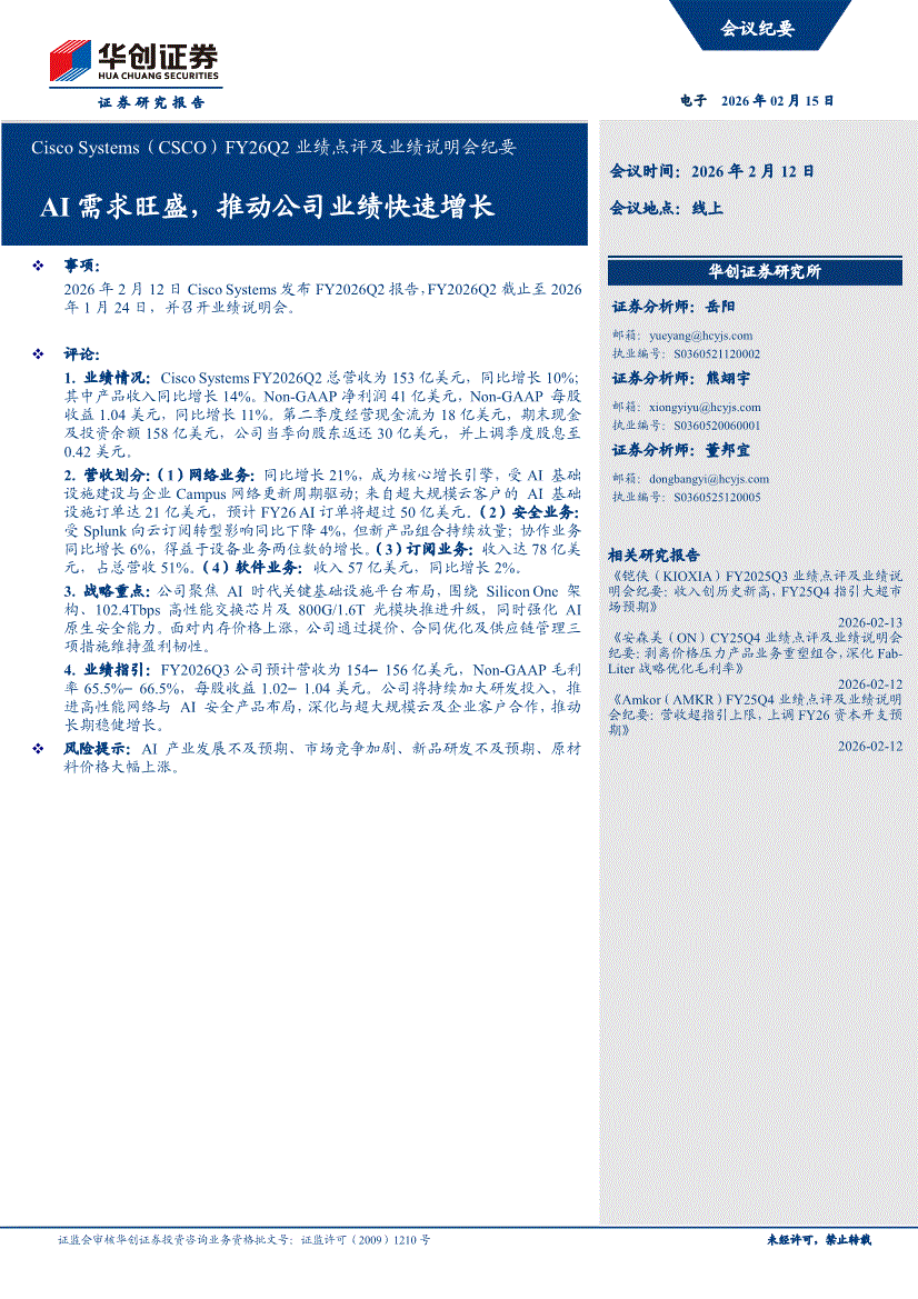 Cisco Systems:华创证券-Cisco Systems-CSCO.US-FY26Q2业绩点评及业绩说明会纪要:AI需求旺盛,推动公司业绩快速增长-260215