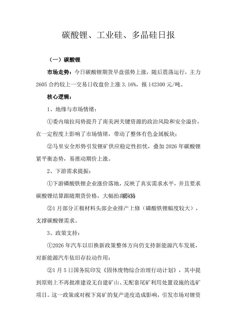 天富期货-碳酸锂、多晶硅、工业硅日报-260116
