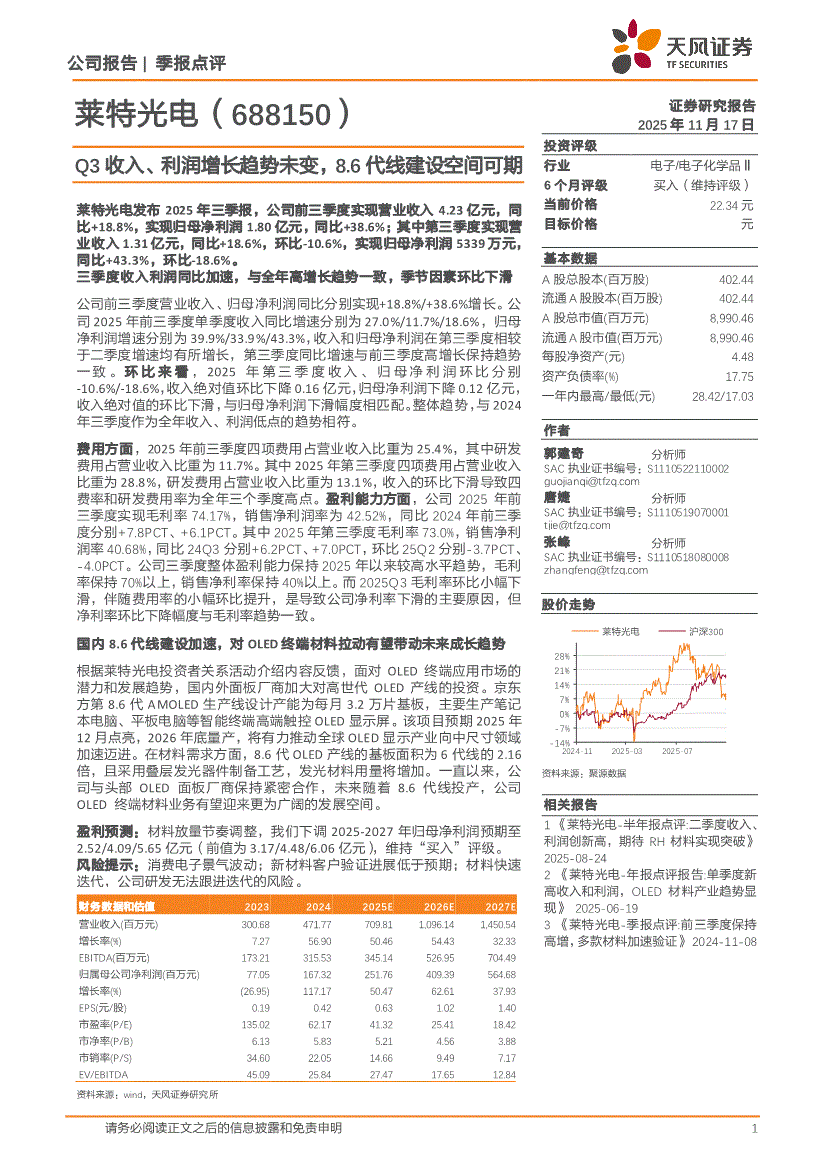 莱特光电:天风证券-莱特光电-688150-Q3收入、利润增长趋势未变,8.6代线建设空间可期-251117