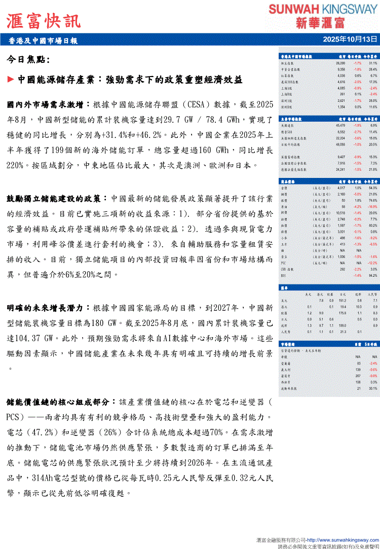 新华汇富-滙富快訊:香港及中国市场日报-251013