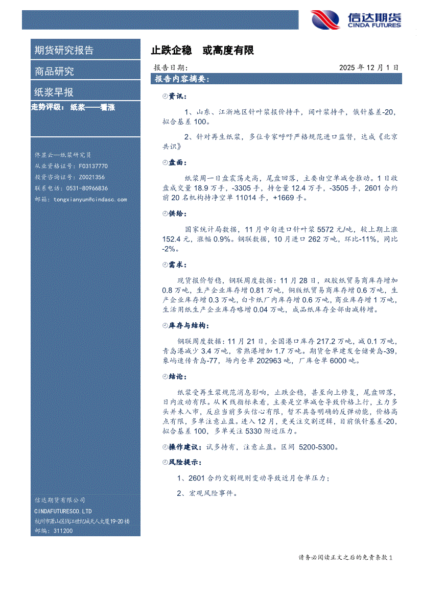 信达期货-纸浆早报:止跌企稳,或高度有限-251201