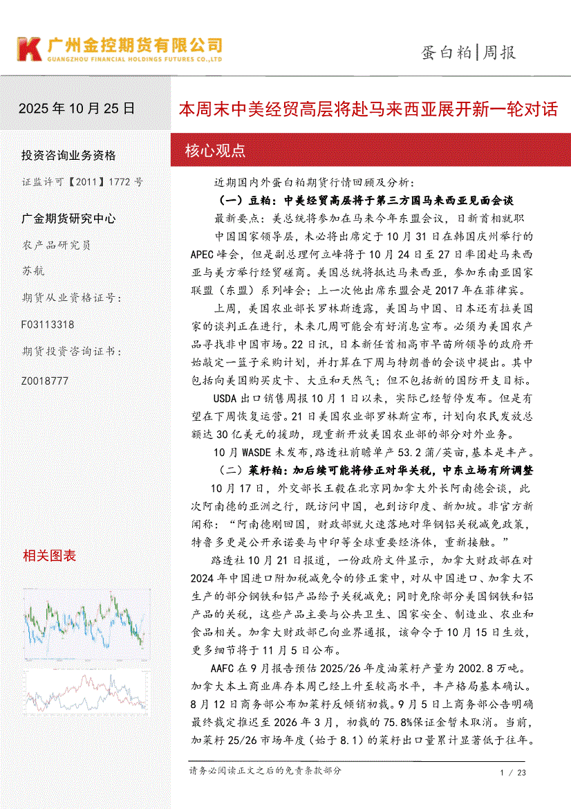 广金期货-蛋白粕周报:本周末中美经贸高层将赴马来西亚展开新一轮对话-251025