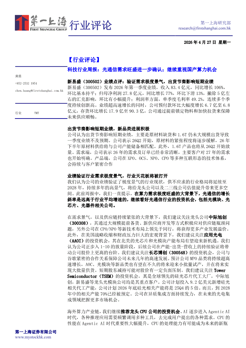 科技行业:第一上海-科技行业周报:光通信需求旺盛进一步确认;继续重视国产算力机会-260427
