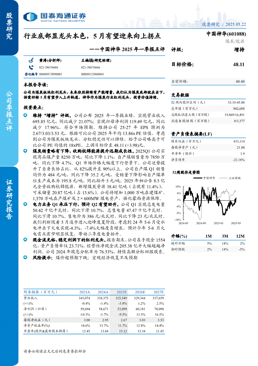 中国神华:国泰海通证券-中国神华-601088-2025年一季报点评:行业底部显龙头本色,5月有望迎来向上拐点-250522