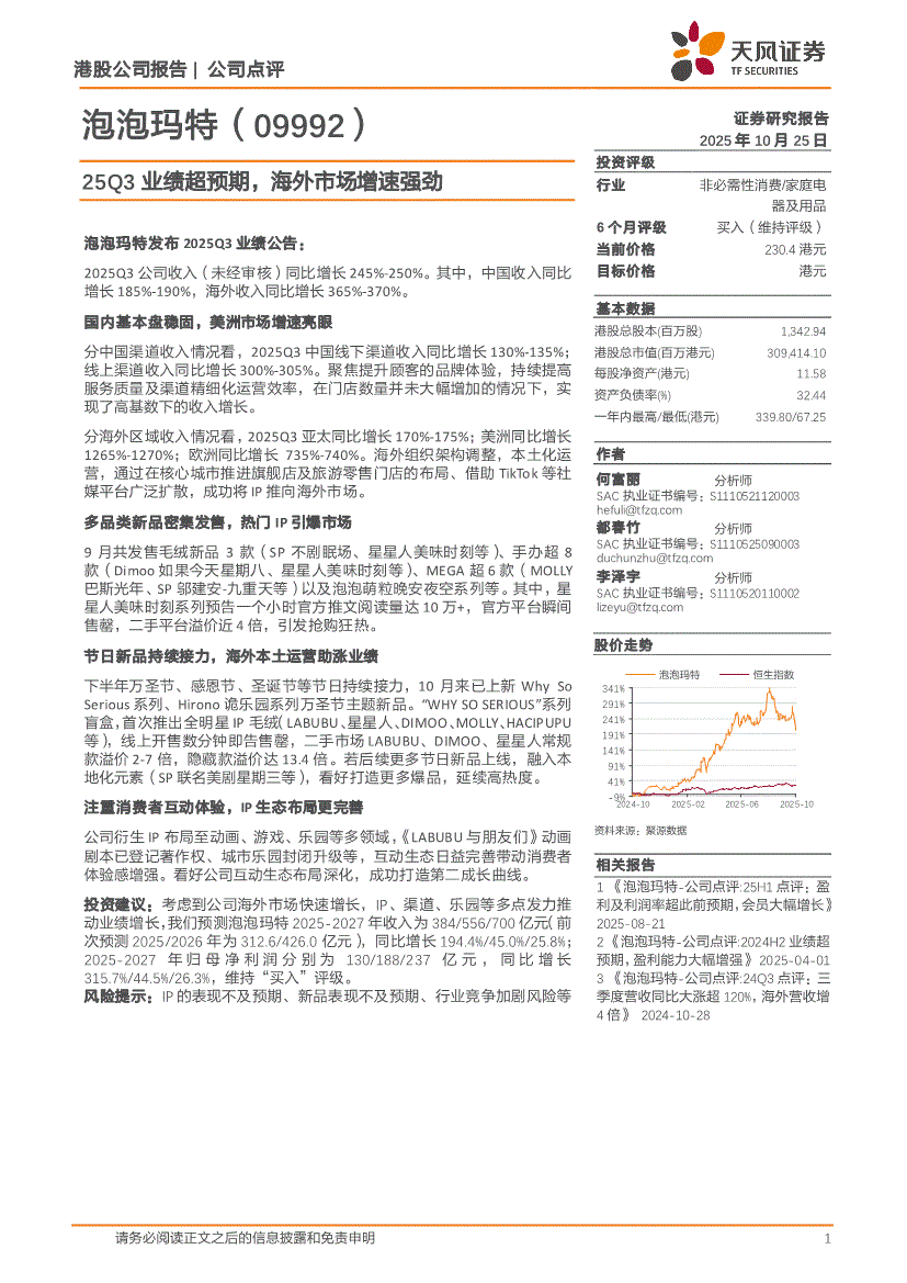 泡泡玛特:天风证券-泡泡玛特-9992.HK-25Q3业绩超预期,海外市场增速强劲-251025
