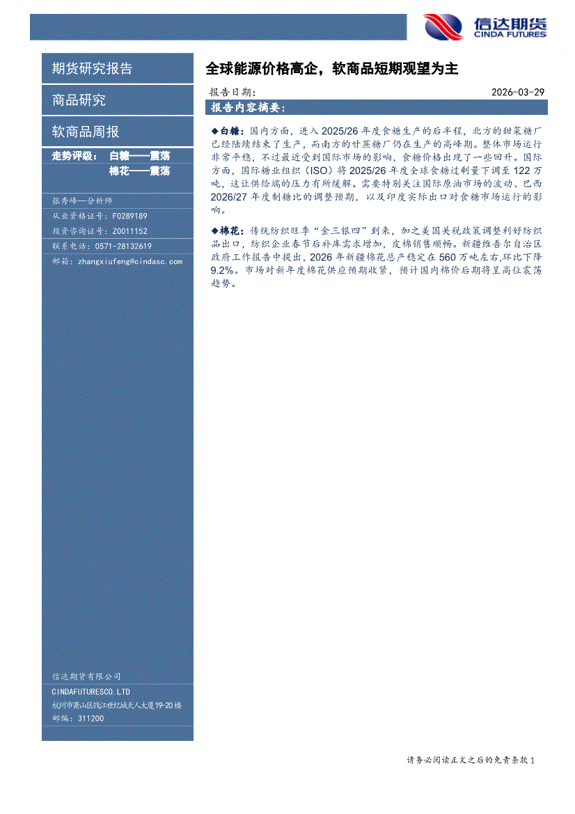 信达期货-软商品周报:全球能源价格高企,软商品短期观望为主-260329
