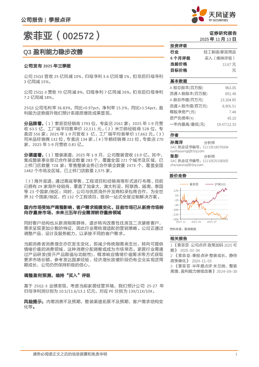 索菲亚:天风证券-索菲亚-002572-Q3盈利能力稳步改善-251113