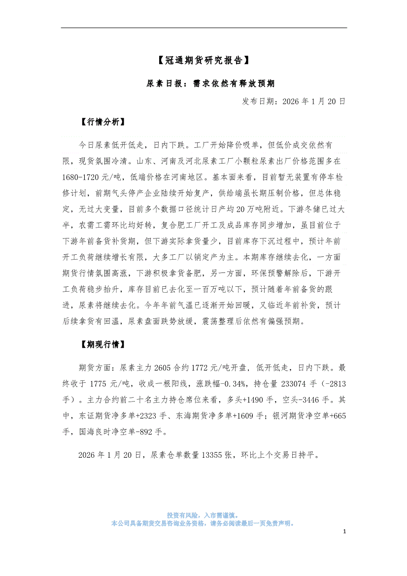 冠通期货-尿素日报:需求依然有释放预期-260120