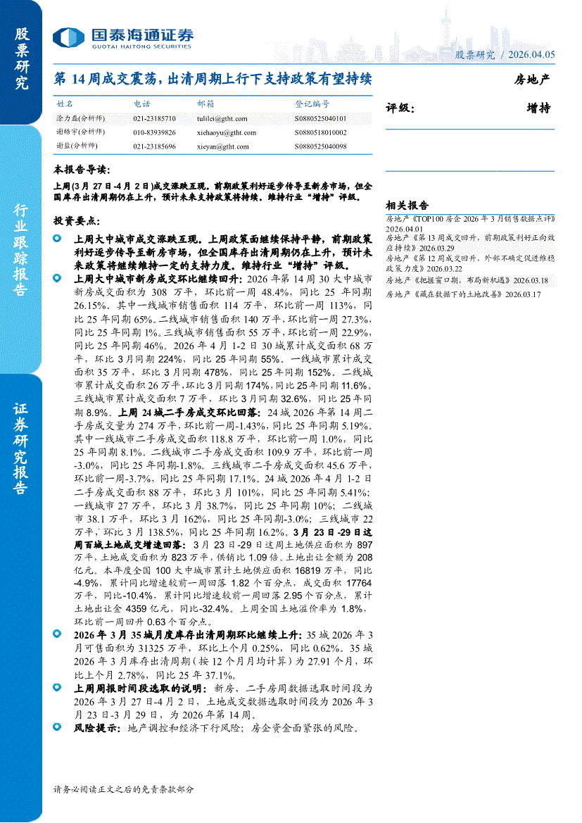 房地产行业:国泰海通证券-房地产行业:第14周成交震荡,出清周期上行下支持政策有望持续-260405
