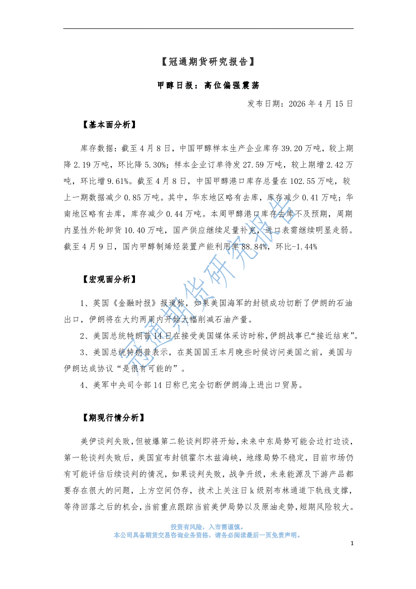冠通期货-甲醇日报:高位偏强震荡-260415