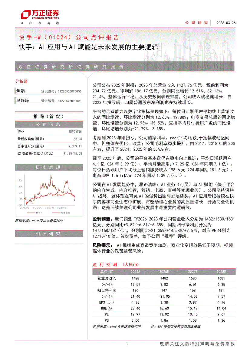 快手~W:方正证券-快手~W-1024.HK-公司点评报告:AI应用与AI赋能是未来发展的主要逻辑-260326