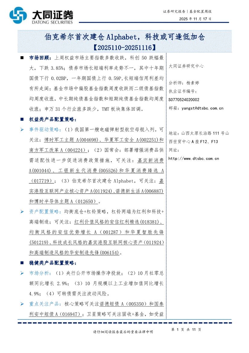 大同证券-基金配置周报:伯克希尔首次建仓Alphabet,科技或可逢低加仓-251117