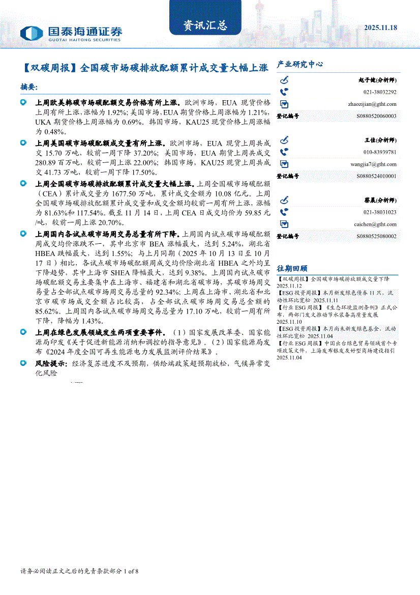 国泰海通证券-资讯汇总:【双碳周报】全国碳市场碳排放配额累计成交量有所下降-251029