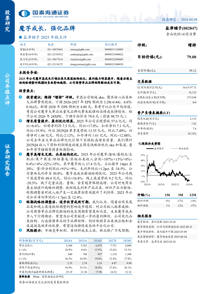 盐津铺子:国泰海通证券-盐津铺子-002847-2025年报点评:魔芋成长,强化品牌-260408
