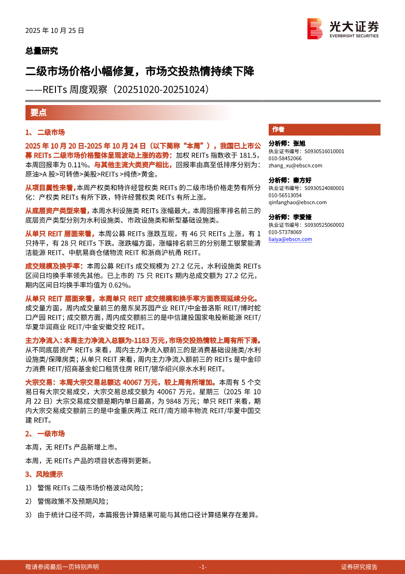光大证券-REITs周度观察:二级市场价格小幅修复,市场交投热情持续下降-251025