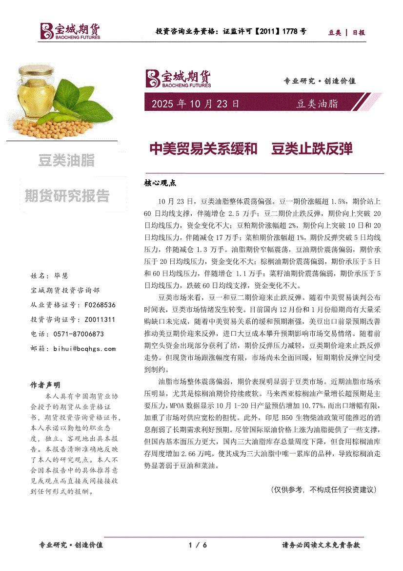 宝城期货-豆类油脂日报:中美贸易关系缓和,豆类止跌反弹-251023