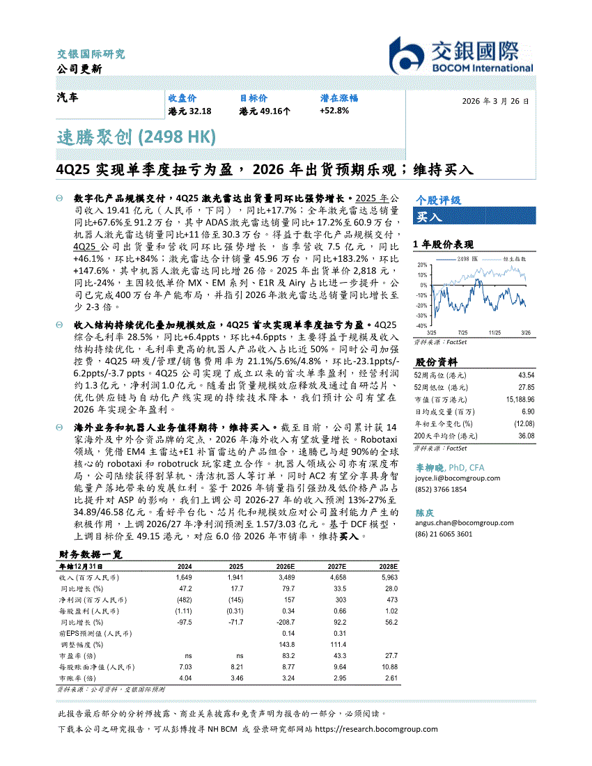 速腾聚创:交银国际-速腾聚创-2498.HK-4Q25实现单季度扭亏为盈,2026年出货预期乐观;维持买入-260326