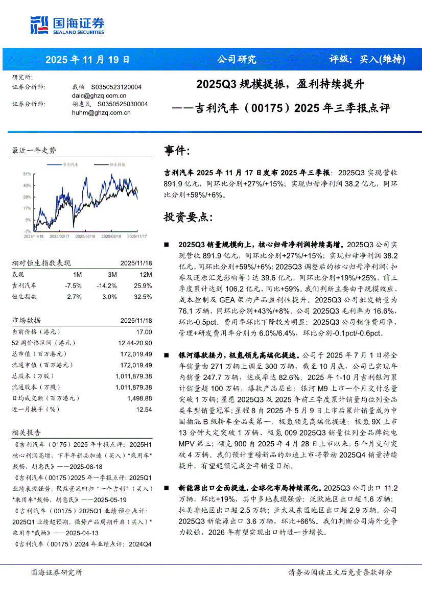 吉利汽车:国海证券-吉利汽车-0175.HK-2025年三季报点评:2025Q3规模提振,盈利持续提升-251119